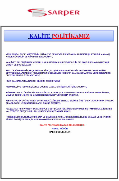 SÜREKLİ GELİŞTİREREK, ÜLKE EKONOMİSİNE KATKIDA BULUNMAYI KALİTE POLİTİKASI OLARAK BELİRLENMİŞTİR.